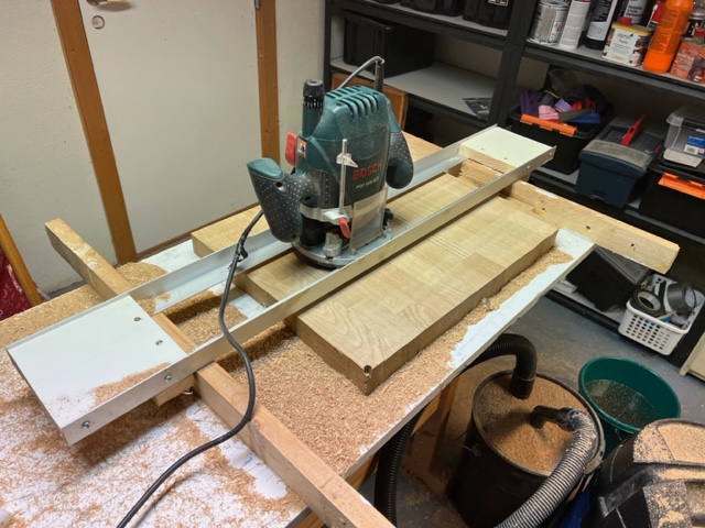 Når limet var tørket var det ny runde med fresen og min hjemmelagde avretterjigg. Når platen var helt rett ble den grovskjært med stikksag slik at den var bittelitt større en det originale lokket den skulle erstatte.